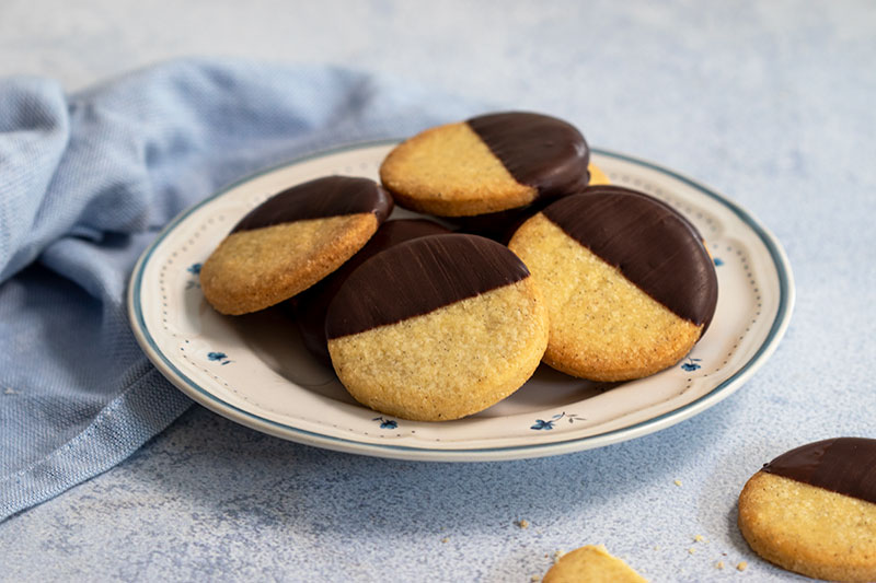 J’ai trempé mes sablés dans du chocolat noir (de Valrhona) mais libre à vous de le remplacer par un autre : chocolat au lait, dulcey, etc. Choisissez tout simplement celui qui vous tente le plus 🙂