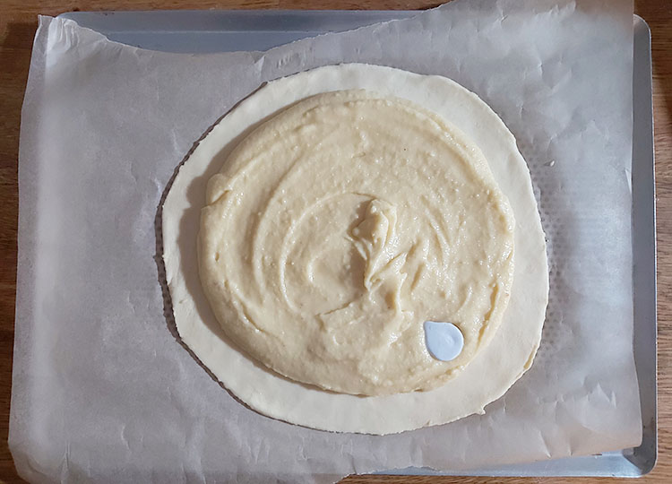 - Disposez la crème frangipane sur un des deux cercles de pâte feuilletée en laissant 2-3 cm sur les bords.