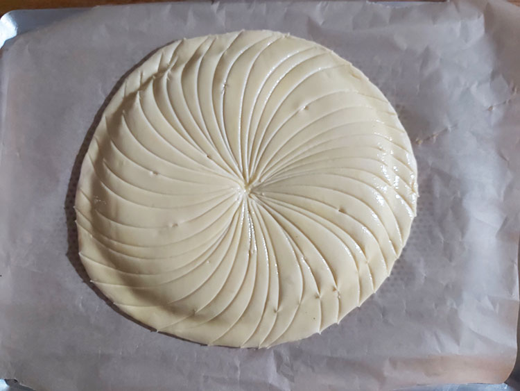 - Dorez le dessus de la galette avec un pinceau trempé dans de l’œuf battu et faites des rayures avec le côté non tranchant d’un couteau.