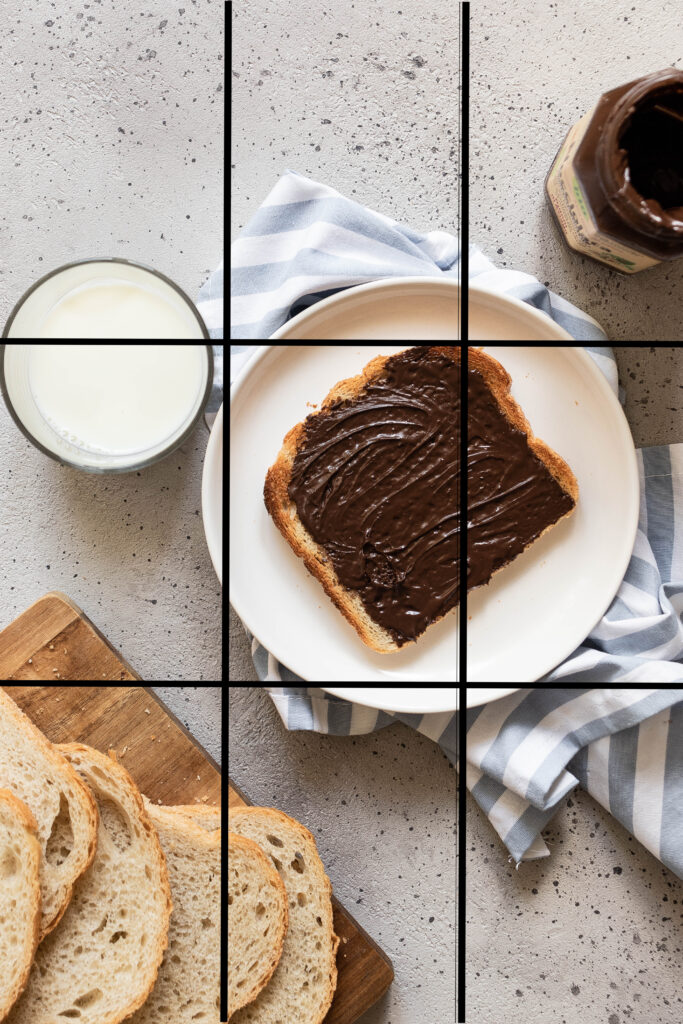La tartine avec pâte à tartiner (héros de la photo) est pile positionnée à l’intersection d’une ligne verticale et horizontale. Cela attire le regard sur le centre d’intérêt principal, sans le centrer complètement, ce qui évite une composition trop rigide.